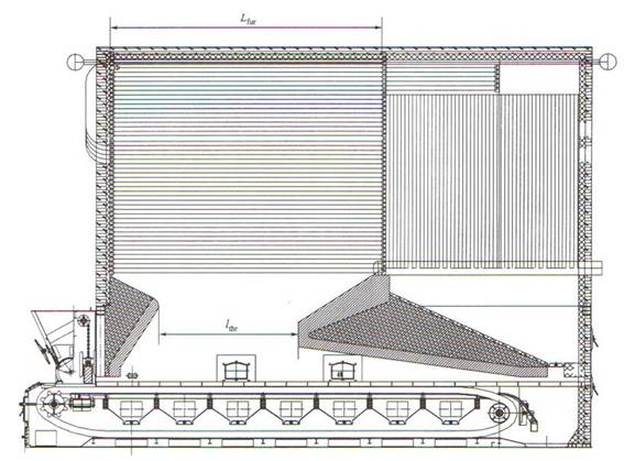 Lfur——沿爐排方向的燃燼室長度,m,見“燃煤鏈條爐排有機(jī)熱載體鍋爐示意圖”;